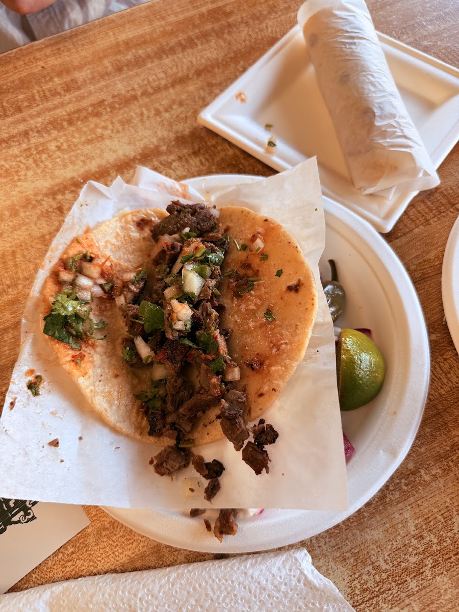 This place is fire ! Freshly cooked asada, chorizo, pollo, but it's all about the crispy tripas and buche. All came on a big and warm homemade tortillas. Perfectly paired well with the strawberry fresco. Perfect Taco Tuesday.
